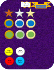 Seniors complete at least 4 "Pin Badge topics" a year to gain a Senior Jade center colour circle award each year; Bronze, Silver & Gold.
